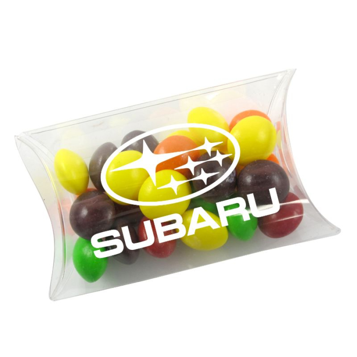 Add a burst of color to your brand! Personalized Small Pillow Acetate Boxes with Skittles® Candies