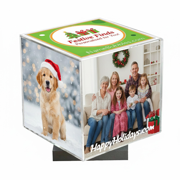 Personalized Spinning Photo Cubes are a thoughtful and unique way to display your favorite memories while making someone feel truly special. This rotating cube holds six photos and gently spins on battery power, creating an interactive and eye-catching display for desks, shelves, or home décor. With easy-to-use photo slots, it allows for full personalization, so each cube is a one-of-a-kind keepsake. Perfect for birthdays, anniversaries, holidays, or special occasions, this cube combines practical design with heartfelt sentiment. Ideal for gift shops, corporate gifting, or personal use, it not only showcases treasured moments but also ensures your thoughtful gesture and your brand, if imprinted leaves a lasting impression.Looking for more? Explore our collection of picture frames right away.Get free design, free online proofs and fastest turnaround offers.