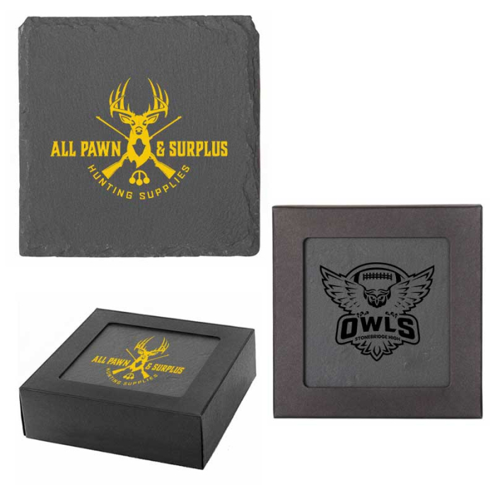 Personalized Square Slate Coaster Sets combine practicality, style, and brand visibility in one sophisticated item. Each coaster is made from natural slate and includes protective feet to safeguard furniture surfaces. Because slate is a natural material, every piece features subtle variations in color and texture, ensuring each coaster is unique. Packaged in sleek onyx presentation boxes, these coasters are gift-ready for corporate promotions, trade shows, or special events. Perfect for use in homes, offices, or hospitality settings, these coasters provide a functional and stylish way to keep your brand in front of clients, customers, or event attendees while offering a memorable and high-quality keepsake.Looking for more? Explore our collection of coasters right away.Get free design, free online proofs and fastest turnaround offers.