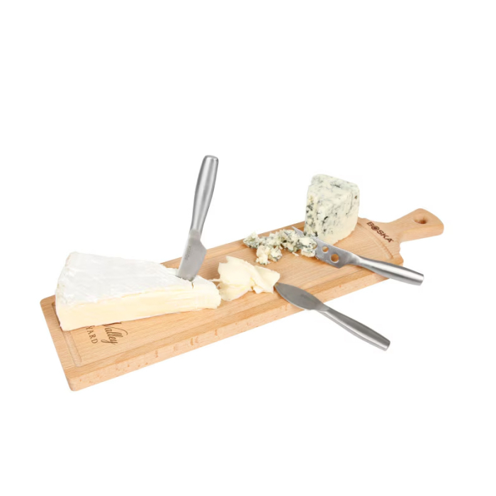 • Includes an oiled beechwood serving board and three knives for soft, semi-hard, and hard cheeses
