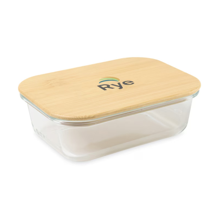 A premium 2-cup bamboo storage container featuring a high-heat resistant borosilicate body to keep your logo front and center in every sustainable home and office.