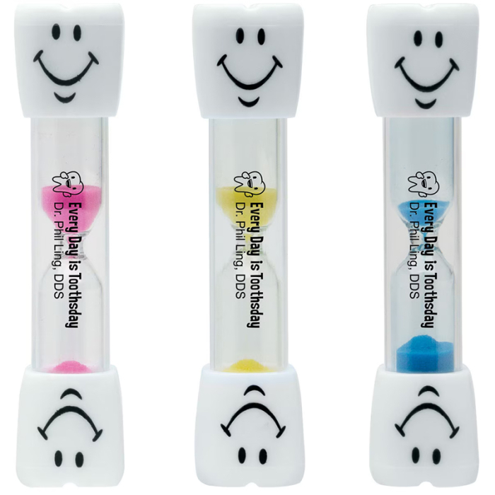 Promotional 3-Minute Toothbrush Sand Timers are a fun and practical way to encourage proper dental hygiene for children and adults alike. Each timer helps users track the recommended three minutes of brushing, promoting healthier smiles and better habits. Available in clear and white designs with pink, blue, or yellow sand, these timers are compact, durable, and easy to display at home, in classrooms, or dental offices. Customizable with your logo, they make an excellent promotional giveaway for pediatric dentists, schools, and wellness campaigns. Combine educational value with brand exposure in a memorable and useful item.Looking for more? Explore our collection of dental promotional items right away.Get free design, free online proofs and fastest turnaround offers.