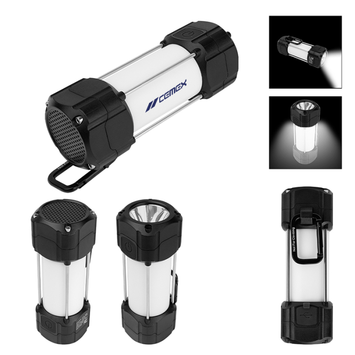 Promotional Canyon COB Lanterns with Speaker are designed to deliver versatile performance for outdoor events, emergency kits, and branded giveaways. The extra bright white COB worklight combined with LED lighting provides reliable illumination with three adjustable settings—high, low, and flashing—to suit different environments. Integrated Bluetooth® 5.3 technology allows users to pair devices from up to 33 feet away and enjoy clear, dynamic stereo sound for up to four hours of speaker-only playtime. Push-button controls make operation simple, while the water-resistant construction adds durability for outdoor use. Featuring a built-in carabiner for easy attachment and a rechargeable 1,800 mAh battery with Type-C charging, this lantern is a practical, high-impact promotional item that keeps your brand visible day or night.Looking for more? Explore our collection of flashlights  right away.Get free design, free online proofs and fastest turnaround offers.