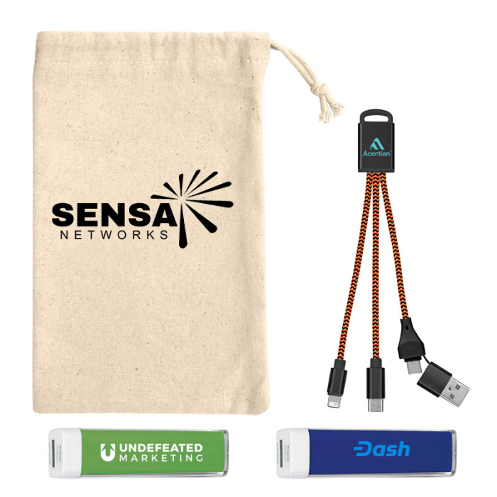 Available Colors: Pouch: Natural, Power Bank: Black, Blue, Green, Light Blue, White, Charging Cable: Blue, Lime Green, Navy, Orange, Red, Silver. Product Size: Pouch: 8 1/4" W x 4 3/4" H, Power Bank: 3 1/2", Charging Cable: 3/4" W x 6 1/4" H Imprint Area: 4" W x 3" H . Box Weight: 16 lbs Packaging: 50 Pcs Material: Pouch: Cotton Production Time: 7-10 Business Days Additional Information: Delivery time is based on the shipping method selected.