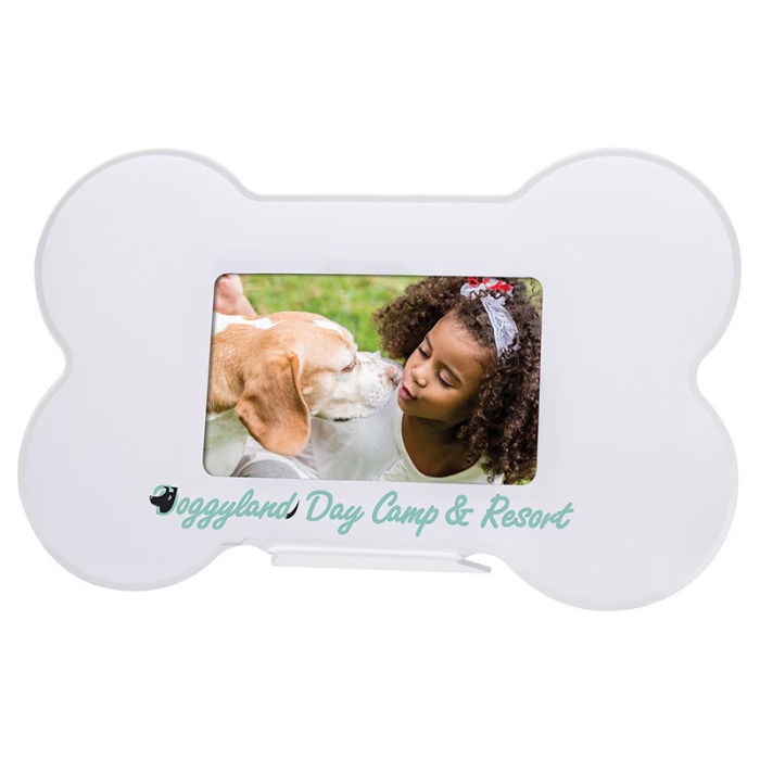 Promotional Dog Bone Photo Frames add a playful touch to photo displays while keeping your brand visible. Designed to hold a 3” x 2” photo insert, these frames feature a sturdy bent easel that allows them to stand securely on desks, shelves, or counters. Made from high-quality acrylic, they offer durability and a clean, polished look. Multiple imprint areas provide added flexibility for logos, messages, or event details. Perfect for pet businesses, veterinary clinics, animal shelters, or pet-themed promotions, these frames create a fun and memorable accent piece for both home and office settings.Looking for more? Explore our collection of  picture frames right away.Get free design, free online proofs, and fastest turnaround offers.