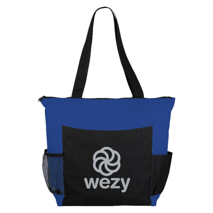 Promotional Grandview Zippered Convention Tote is made from durable 600D PolyCanvas and features a spacious zippered main compartment, front pocket with business card slots, elastic pen loops, and dual side pockets for accessories and a water bottle. Finished with sturdy 25" handles, it’s perfect for conventions, work, or daily use.Order these tote bags  right away to get free design, free online proofs and fastest turnaround offers.
