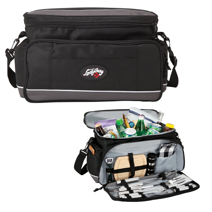 Promotional Penn Valley BBQ and Cooler Bag is the ultimate companion for outdoor entertaining and on-the-go meals. This versatile set combines a spacious 15-can cooler with a thoughtfully curated 13-piece BBQ and picnic kit. The BBQ tools include a spatula, tongs, and fork, while the picnic essentials feature two knives, two forks, two napkins, salt and pepper shakers, a 6" x 5" cutting board, and a corkscrew/bottle opener. Designed for convenience, the cooler includes a front pocket, two side pockets, and a removable adjustable shoulder strap for comfortable carrying. Whether you’re heading to a picnic, tailgate, or beach day, this all-in-one set delivers functionality, style, and strong brand visibility in one memorable promotional gift.