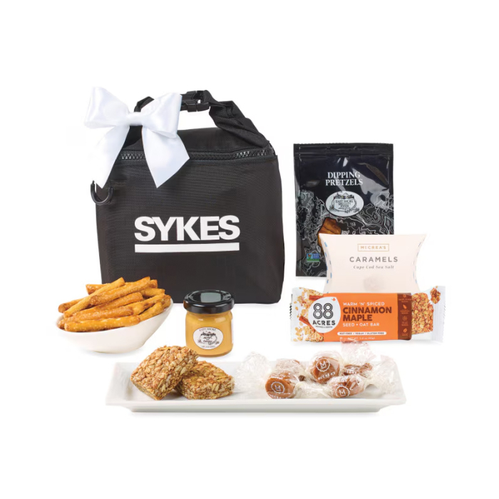 Perfect for gifting clients, employees, or friends, each Remmy Pouch combines indulgent flavors with elegant presentation. The customizable ribbon adds a personal touch, while the convenient pouch design makes it easy to hand out or display. Sweet caramels, hearty oat bars, crunchy pretzels, and tangy mustard create a balanced snack experience that’s sure to impress. Lightweight, portable, and visually appealing, this pouch is a versatile gift that’s ready to enjoy anywhere, anytime, and leaves a lasting impression with every recipient.Looking for more? Explore our collection of food & candy gift baskets right away.Get free design, free online proofs and fastest turnaround offers.