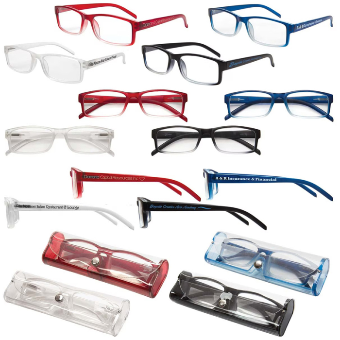 Promotional Soft Feel Reading Glasses with Matching Case combine comfort, style, and practicality for everyday use. The soft-feel frames provide a smooth matte finish that enhances comfort during prolonged wear, while the included color-coordinated protective case ensures safe storage at home, work, or on the go. Available in four stylish colors—frosted, red, blue, and black—and three magnifications (+1.50, +2.00, +2.50), these glasses meet a variety of visual needs. Fully compliant with ANSI Z80.3, FDA 21 CFR 801.410, and Prop 65 standards, they make ideal promotional items for corporate gifts, tradeshows, fundraisers, and customer appreciation campaigns.Looking for more? Explore our collection of sunglasses right away.Get free design, free online proofs and fastest turnaround offers.