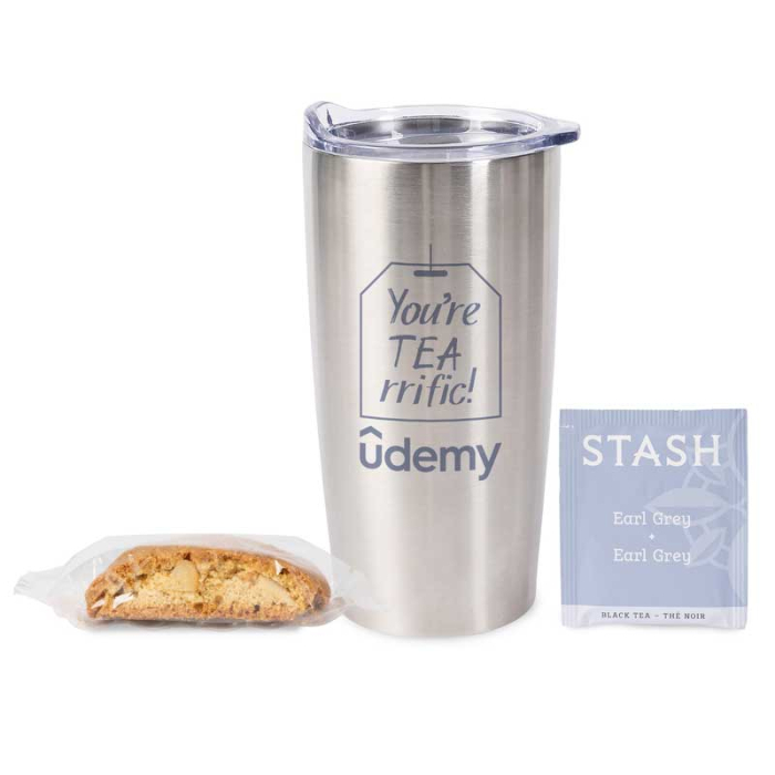 A relaxing sip paired with a tasty treat.A 20 oz stainless steel tumbler set with Stash tea and biscotti for a memorable branded gift.