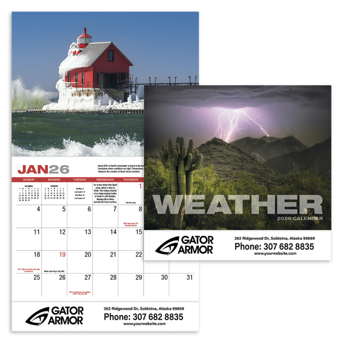 The Weather Almanac Appointment Stapled Wall Calendar features stunning images of mesmerizing weather phenomena, making it a captivating addition to any space. This 13-month calendar includes December printed on the backmount for added utility. Printed on high-quality gloss paper stock with a UV-coated cover, it offers durability and vibrant visuals. The paper is sourced from FSC® and SFI certified mills, supporting sustainable and responsible forestry practices. Perfect for weather enthusiasts and those who appreciate nature’s dramatic displays. Order these wall calendars right away to get free design, free online proofs and fastest turnaround offers.