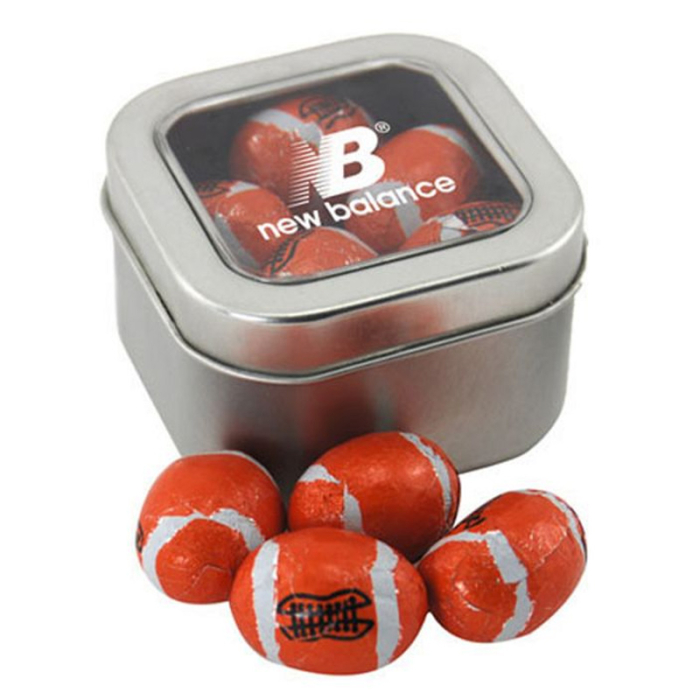 Promotional Window Tins with Chocolate Footballs are a fun and tasty way to promote your brand while delighting recipients with a sporty chocolate treat. Each tin features a clear window top that displays the chocolate footballs inside, creating instant visual appeal and enhancing your branded giveaway. The reusable tin keeps your logo visible long after the chocolates are enjoyed, extending your promotional reach. Bulk packed for convenience, these tins are perfect for trade shows, football games, corporate gifting, tailgate parties, and seasonal promotions. With custom imprinting and playful athletic appeal, these tins turn every giveaway into a memorable and engaging brand experience.Looking for more? Explore our collection of individual chocolates  right away.Get free design, free online proofs and fastest turnaround offers.